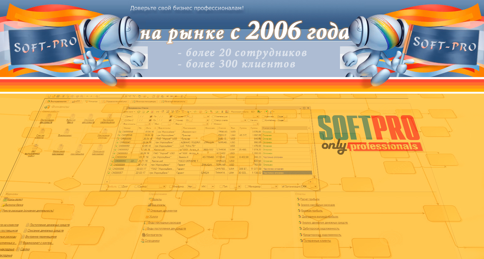История группы компаний "Soft-Pro LTD" началась в 2006 году с создания компании "Софт-Про", специализирующейся на разработке программных продуктов на платформе BAF для Экспедиторских компаний. Инициатива, динамичность и целеустремленность коллектива компании позволили в скором времени развить предприятие, увеличить обороты, завязать прочные деловые связи.